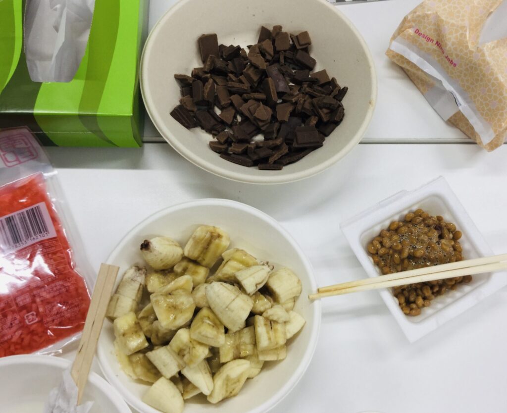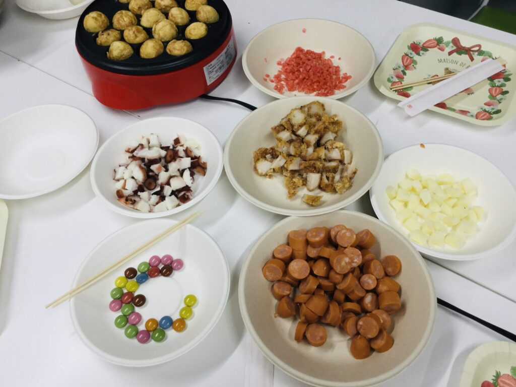 チームごとに具材会議をして、たこ焼きの中に入れる具材を決定! 王道の🐙タコのほかに、マシュマロ、バナナ🍌、キウイ🥝、マーブルチョコ、ソーセージ、キャンディチーズ🧀、ざんぎ🍗など、自由な発想で具材を選びました。
