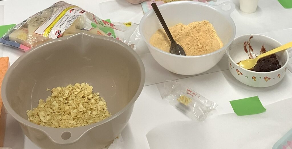 スタッフが用意したメニューは、きなこ・あんこ・のりチーズ・のりしおポテチ・さとうじょうゆ。