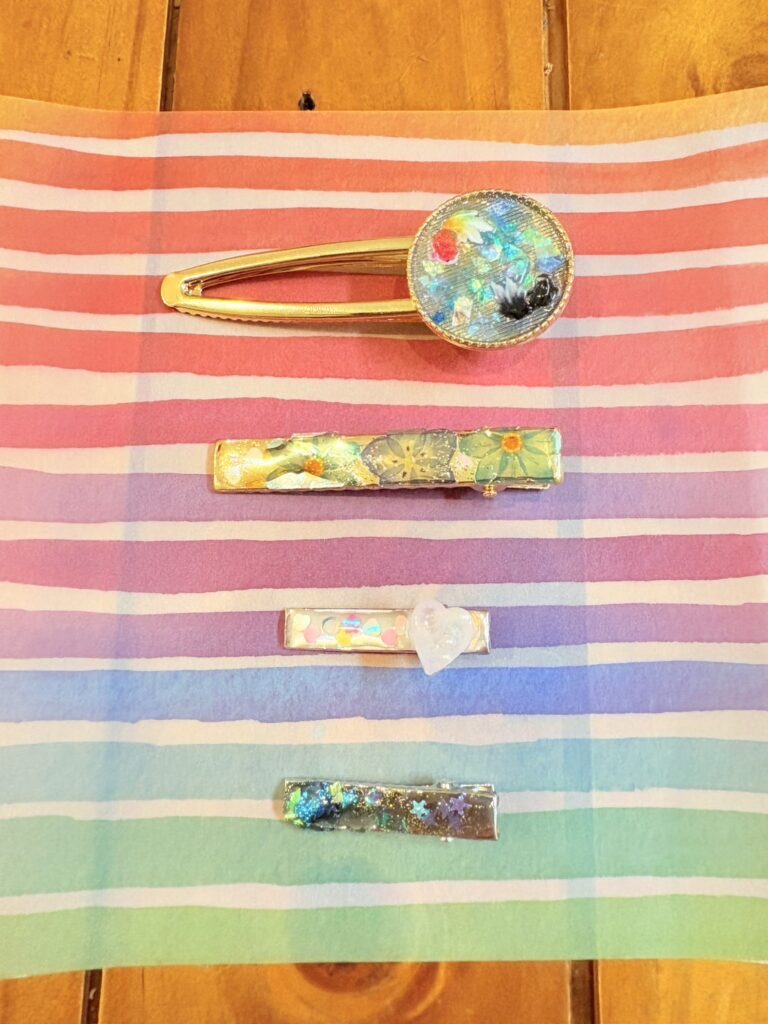 ヘアピンにレジンを塗って、好きな飾りを貼り付けていきます。