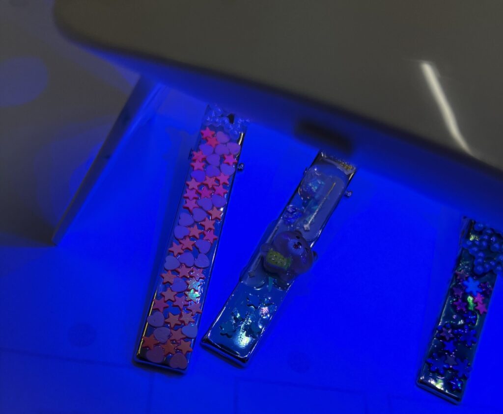1回目の装飾が終わったところで、硬化ライトを当てて固めていきます。