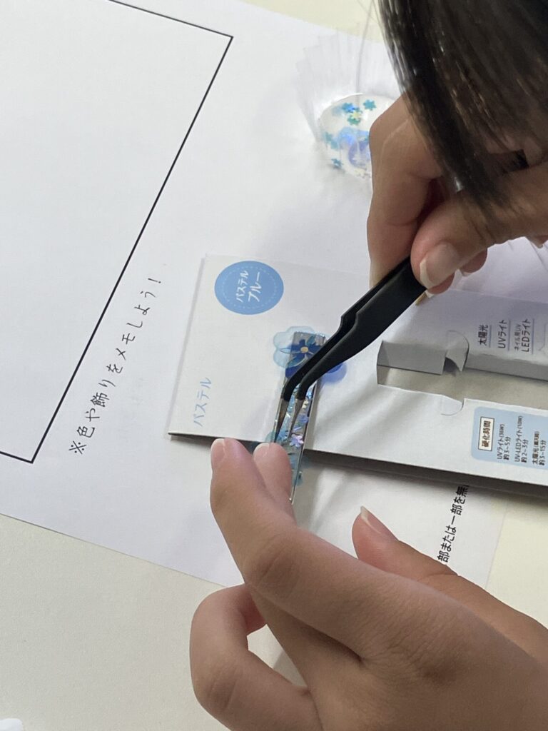 色とりどりの装飾用品を見て、仕上がりをイメージ✨ 紙に描いてイメージを固めていきます。