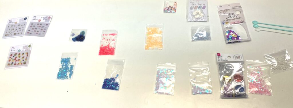 今回のアクセサリーで使用する材料は、ヘアピン、レジン、シールやラメ・スパンコールなどの装飾用品です。