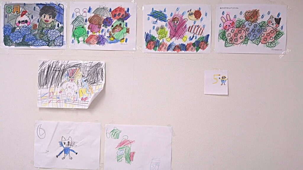 雨やカエルなど、6月にちなんだ絵や、好きな絵柄を描き、