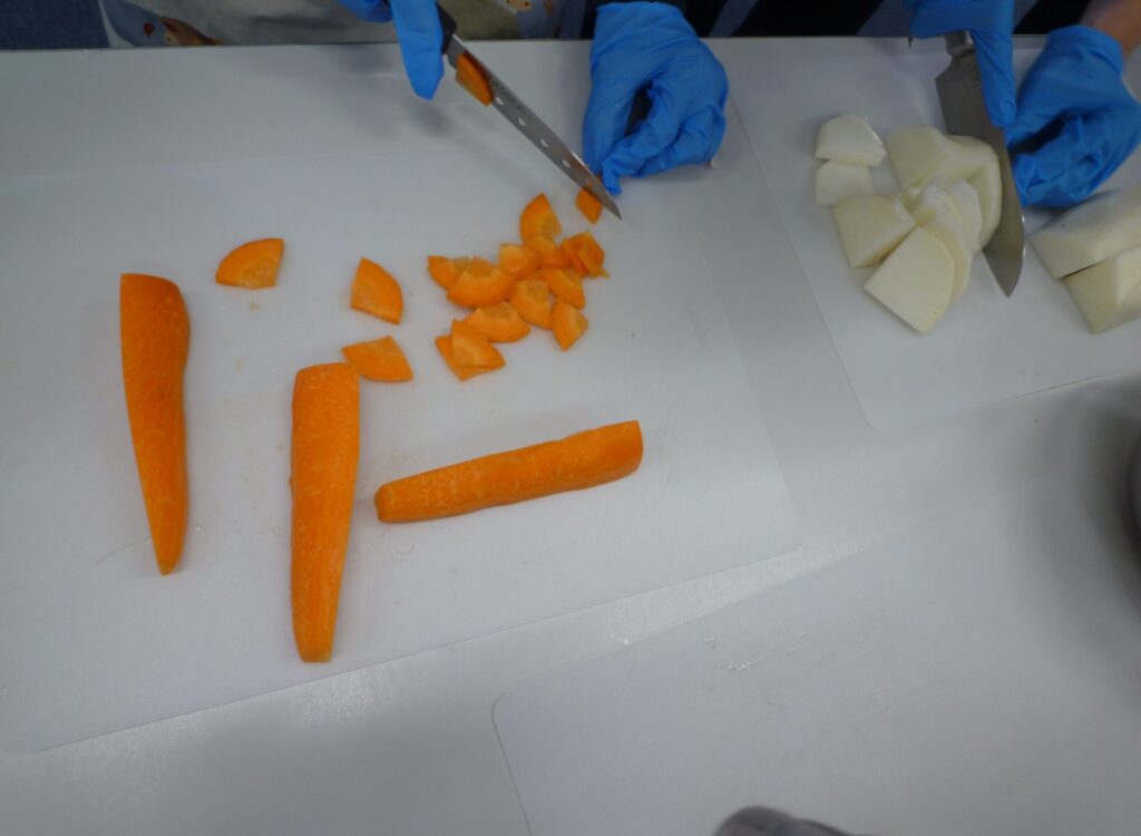 まずは役割を分担し、生徒自身で包丁を使い具材を切ってくれています😊