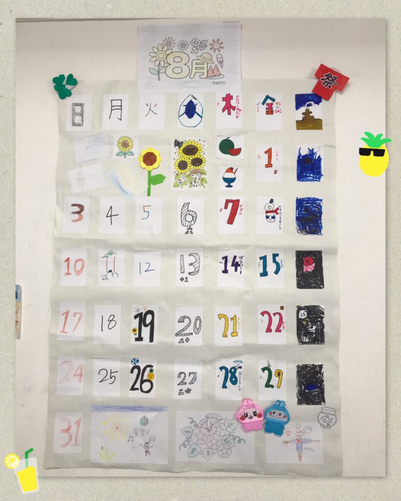 担当する日付や曜日をみんなで決め、数字や曜日をレタリングしたり季節のモチーフを描きました🍉