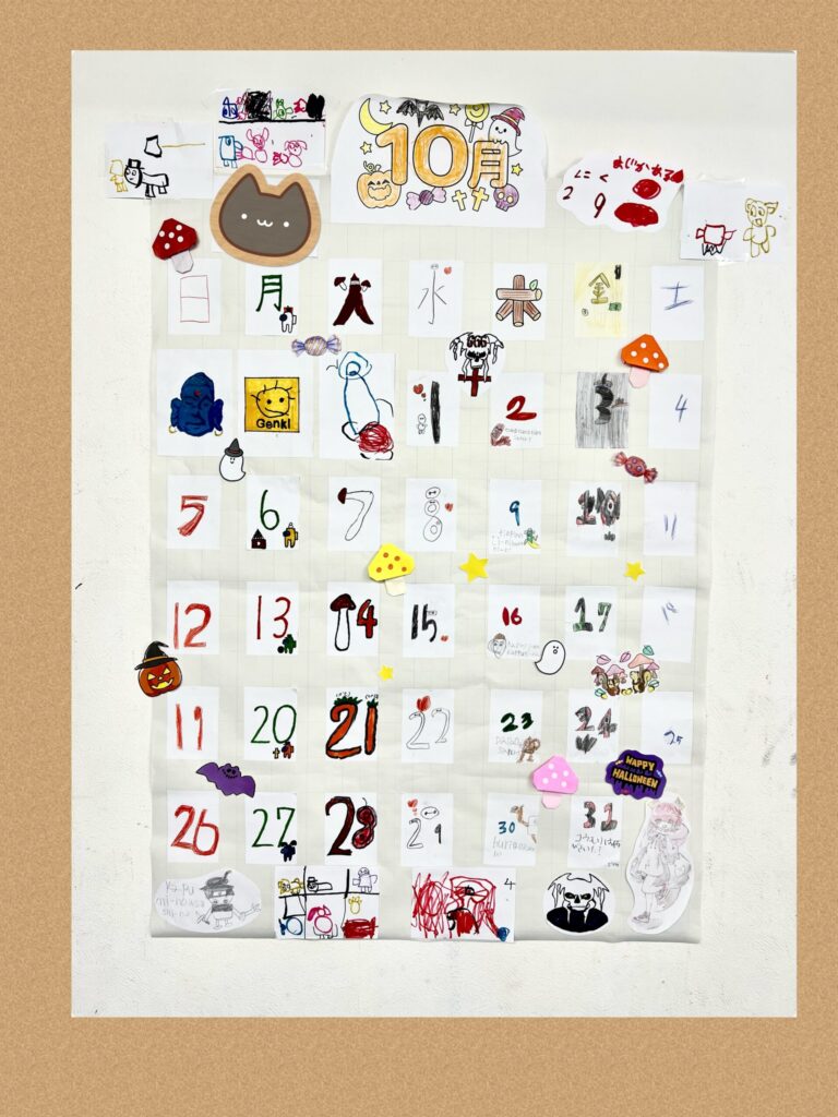 季節感のある折り紙の作品やレタリングなどを取り入れたカレンダーが完成しました✨ハロウィンなどのイラストが並び、秋らしいカレンダーができあがりました🍄