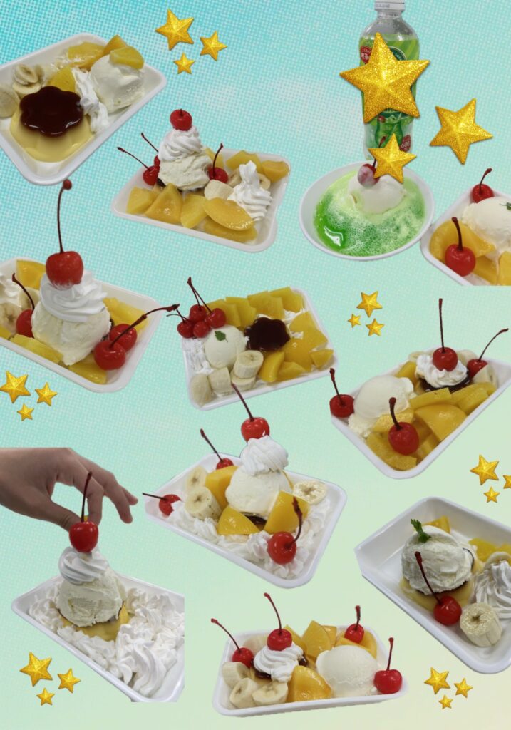 プリンとアイスクリームのまわりにホイップクリームやカットフルーツを飾って、オリジナルのプリンアラモードをつくりました🎵それぞれ配置にこだわりながら、美味しそうなデザートをつくりおいしく食べました😊