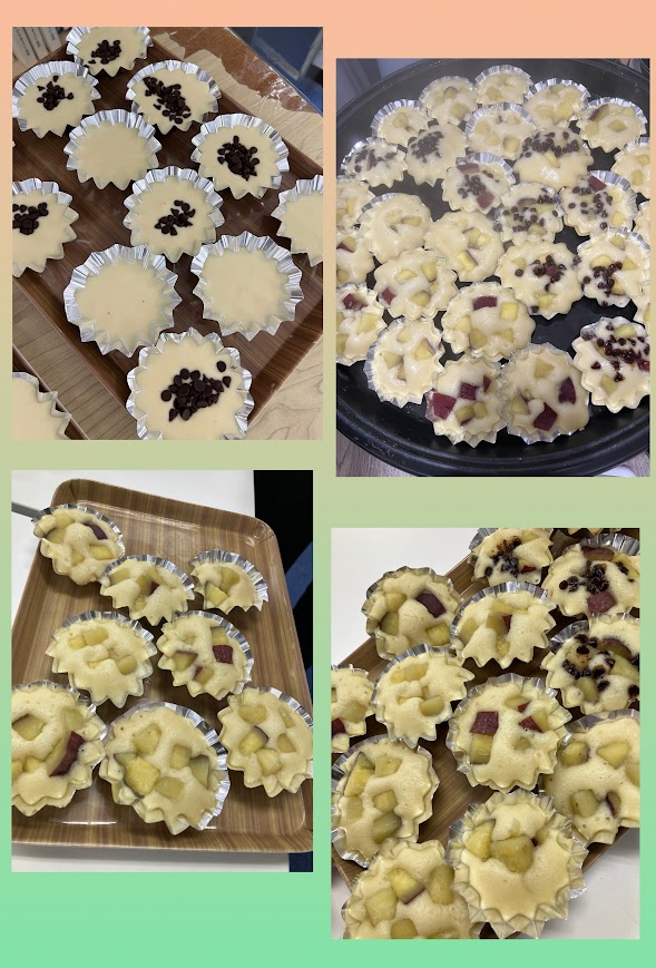 ホットプレートを使って蒸しケーキをつくりました。秋らしくサツマイモや、チョコチップをトッピングして蒸しあげました。できあがるとみんなで喫食し、おかわりにはチョコソースをかけて美味しそうに食べる様子が見られました。