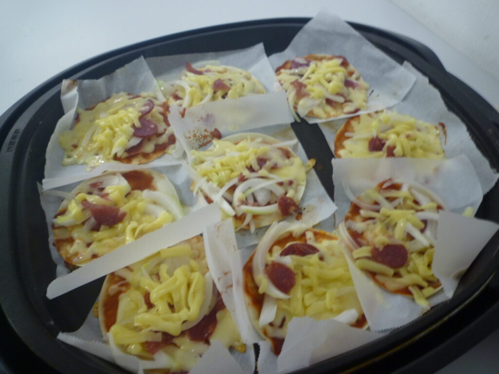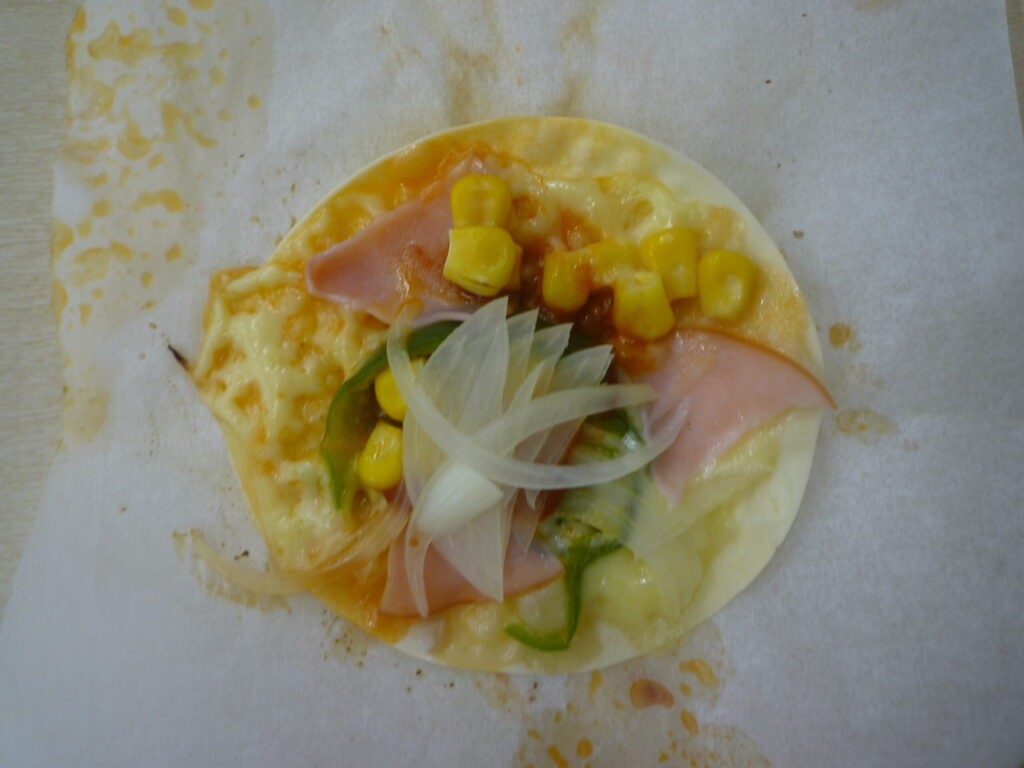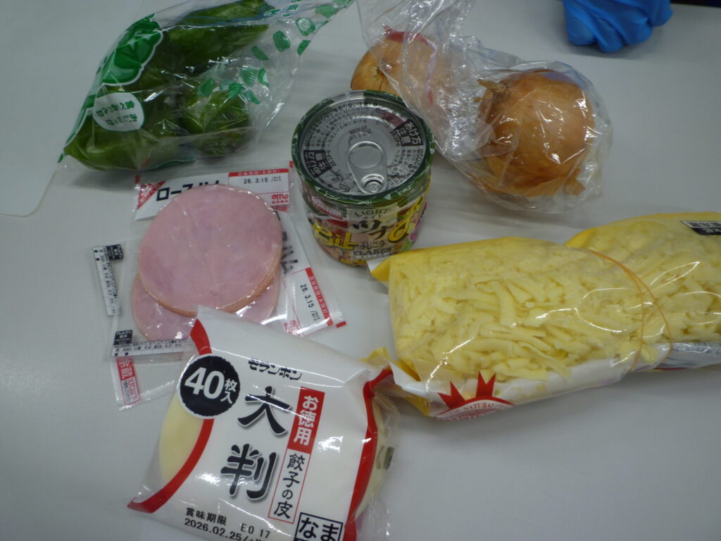 今月は、クッキングペーパーの上に餃子の皮を置き具材を乗せ、ホットプレートで焼くだけの簡単なピザを作りました!