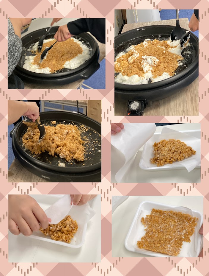バターとマシュマロをホットプレートで溶かして、砕いて細かくしたコーンフレークを投入!よく混ぜてマシュマロおこしを作りました😊 1人分ずつお皿の上でクッキングシートに挟んで広げ、食べやすい形に伸ばし固めることができました✨教室が甘いにおいに包まれて、幸せなおやつタイムでした✨