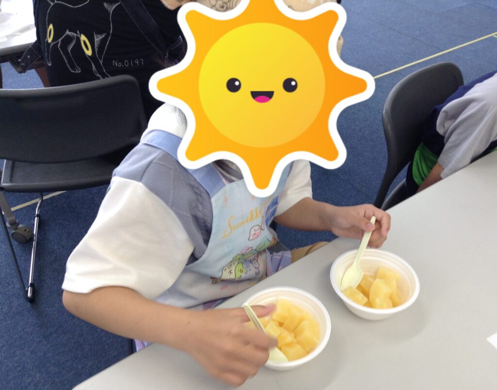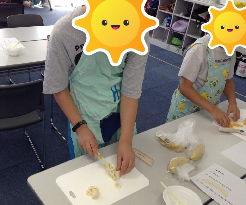 バナナ・桃を切るグループ、みかん・パイナップルを分けるグループ、トッピングなどに使う材料を分けるグループに分かれて作業をしました。