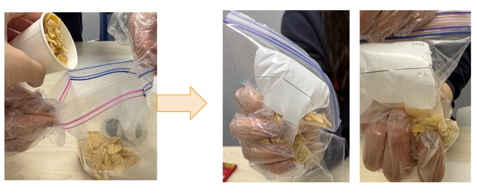 コーンフレークを袋に入れて、手でぎゅっぎゅっと砕いていきます。