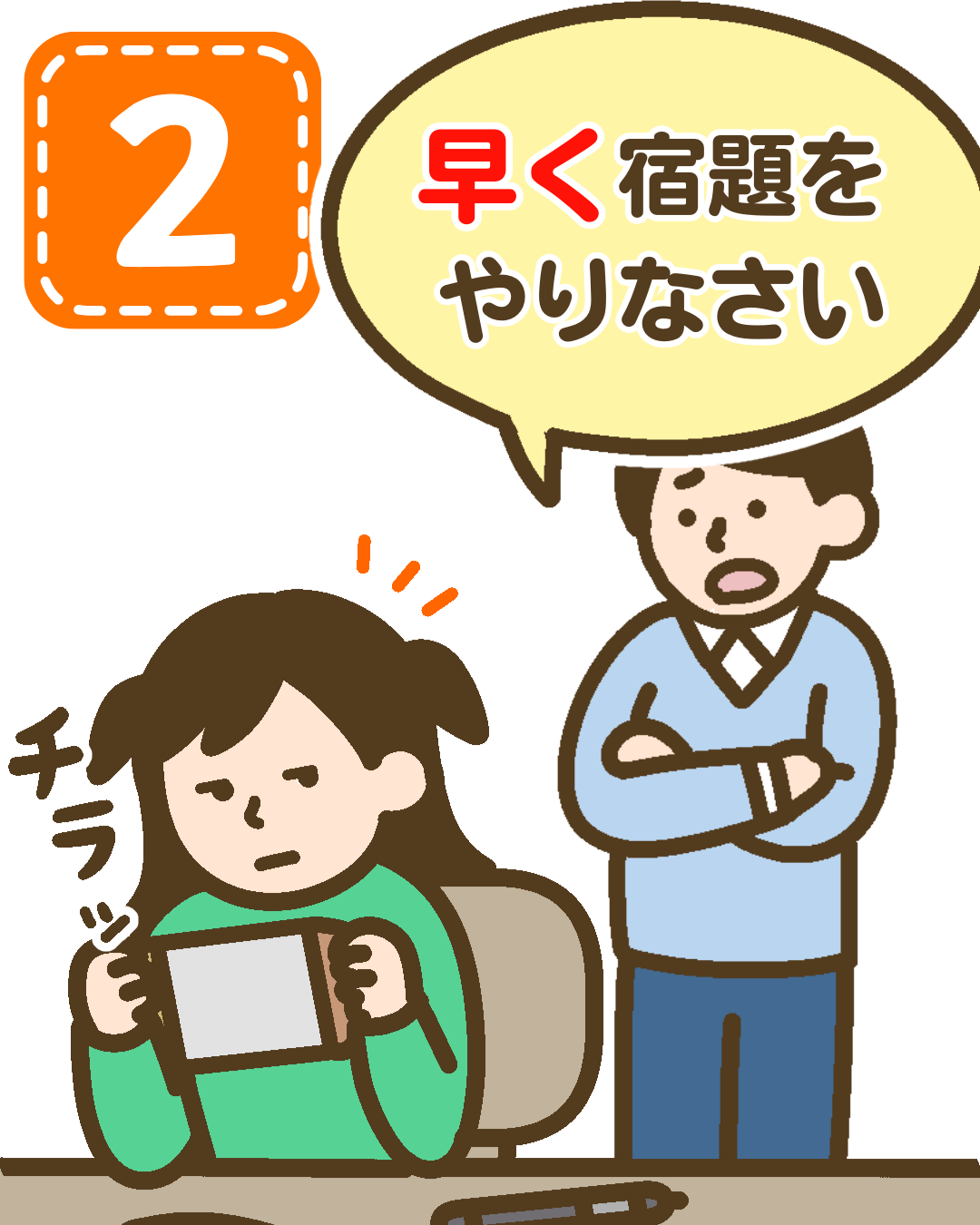 具体的かつ明確に「●時まで」「●分後」など定量的に伝えるようにしましょう。そのほかにも「都合のいいときに」「ちょっとだけ多く」「もう少し頑張りなさい」などの抽象的な表現も、お子さまを混乱させてしまうことに繋がるため注意が必要です。
