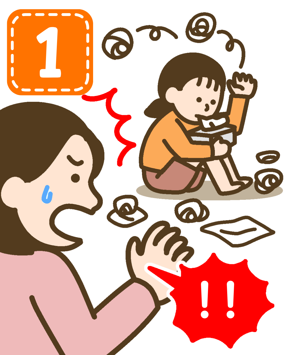 「その場」で起こっていないことを指摘することで、お子さまは混乱してしまいます。保護者の方にとっては関連性の高いことであったとしても、かえって逆効果になるので避けるようにしましょう。