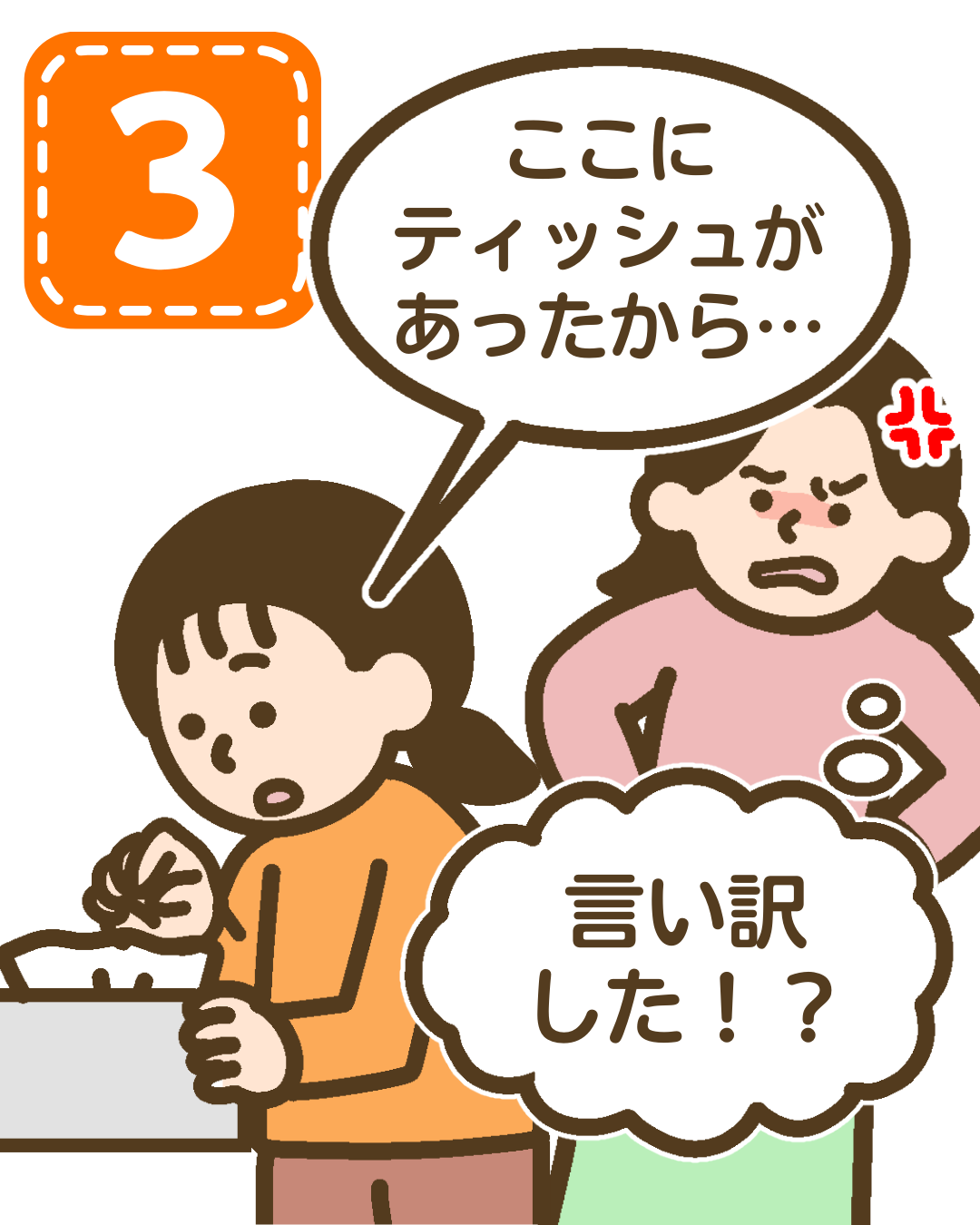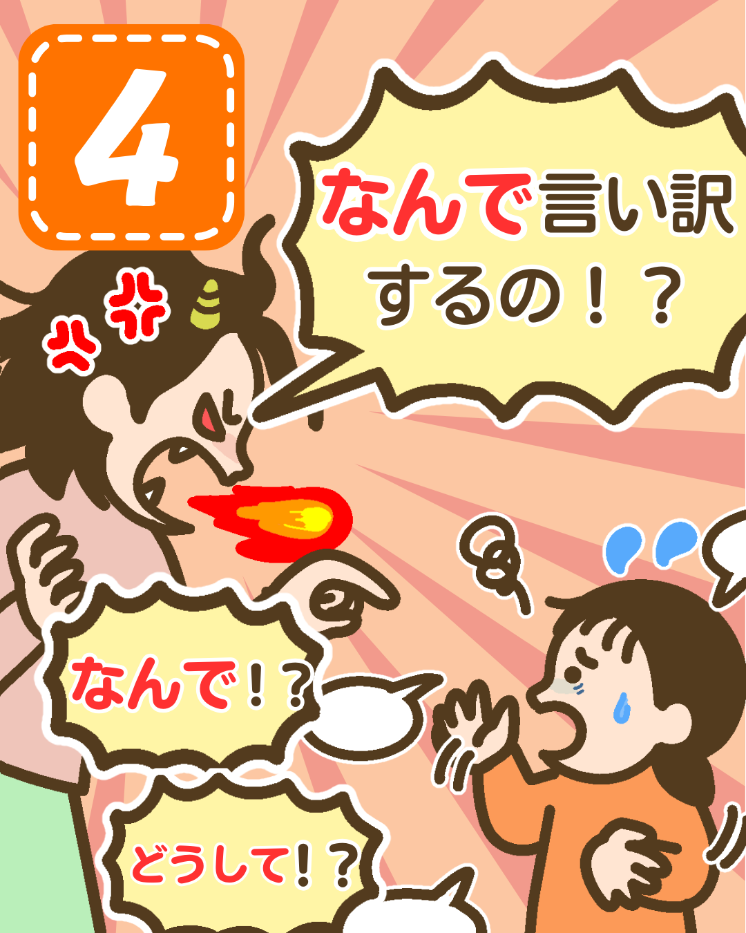 お子さまの発言によって火に油を注ぐ状況に陥っていますが、お子さまは「言い訳」をしたつもりがなく、さらに「なんで!?」と矢継ぎ早に言われて混乱しています。