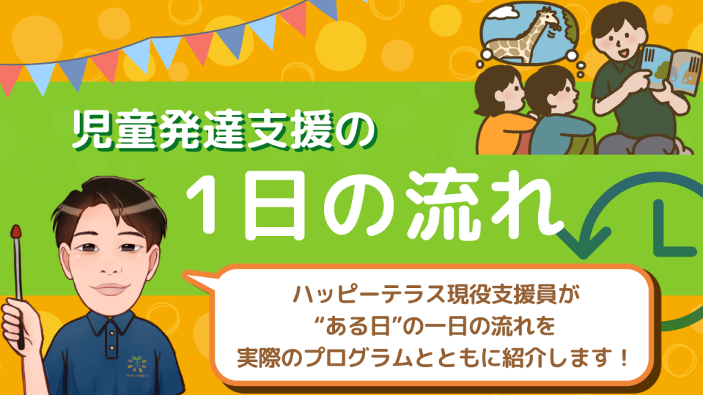 この記事では、児童発達支援のご利用を検討している方に向け、ハッピーテラスキッズの「ある日」の一日の流れにそって、プログラム内容と支援例をご紹介します。