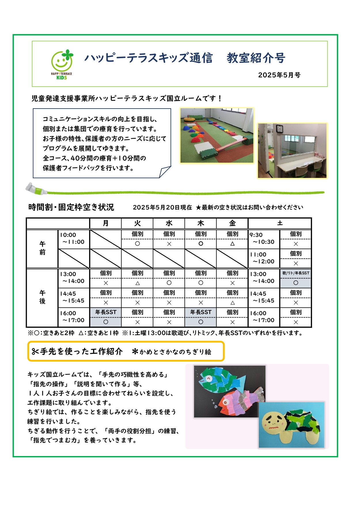 教室号外には、最近実施している工作や、児童発達支援の利用の際に必要な受給者証の申請の流れ等が掲載していますので是非ご覧ください。