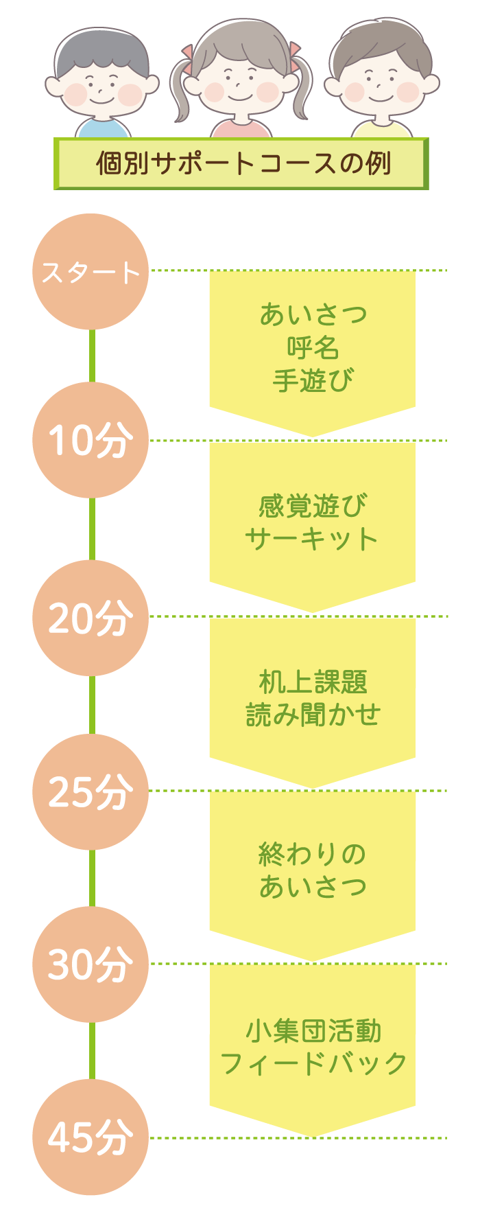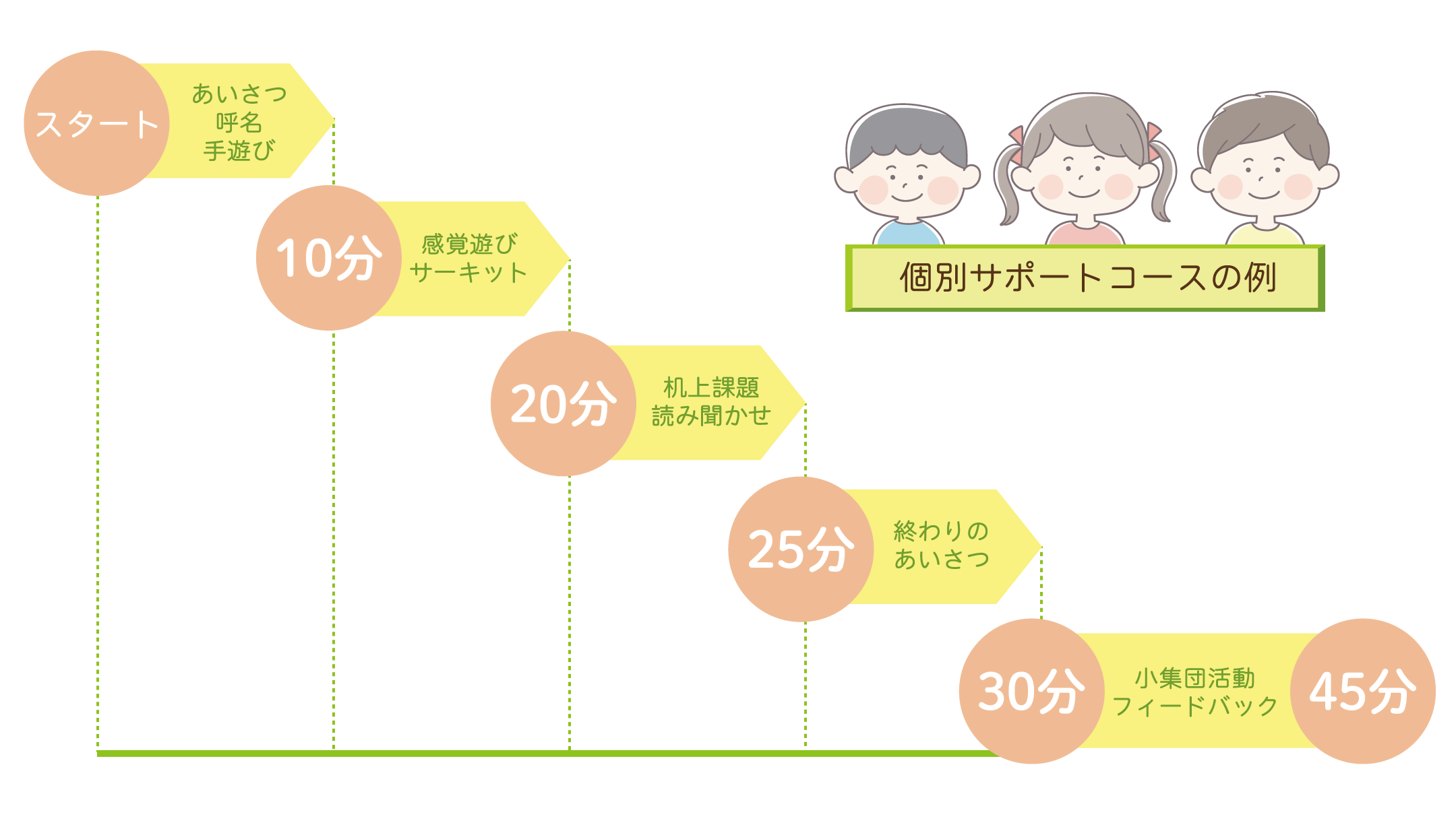 マンツーマンでお子さまの一人ひとりの発達段階に合わせた個別療育を30~45分おこないます。その後、保護者の方にフィードバックをさせていただいている間、他のお子さまと一緒にレクリエーションに参加します。(10~15分)